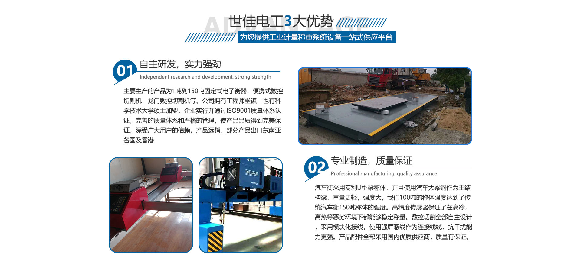 合肥世佳電工設(shè)備有限公司是生產(chǎn)、銷售工業(yè)自動(dòng)化設(shè)備。主要生產(chǎn)的產(chǎn)品為1噸到150噸固定式電子衡器,便攜式數(shù)控切割機(jī),龍門數(shù)控切割機(jī)等。公司擁有工程師坐鎮(zhèn),也有中國科學(xué)技術(shù)大學(xué)碩士加盟,完善的質(zhì)量體系和嚴(yán)格的管理,使產(chǎn)品品質(zhì)得到保證,深受廣大用戶的信賴,產(chǎn)品各地可售,部分產(chǎn)品出口東南亞各國及香港,數(shù)控切割設(shè)備也在安徽處于前列。我們并不滿足現(xiàn)在所取得的成就,公司繼續(xù)加大科研投入,正在和中科大物理研究所科研人員共同研究開發(fā)下一代衡器控制儀表,希望以技術(shù)作為突破口,將公司做大做強(qiáng),為中華崛起盡自己一份綿薄之力。歡迎廣大客戶來廠參觀訂貨考察。